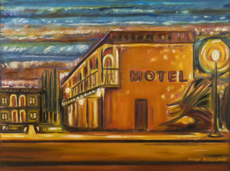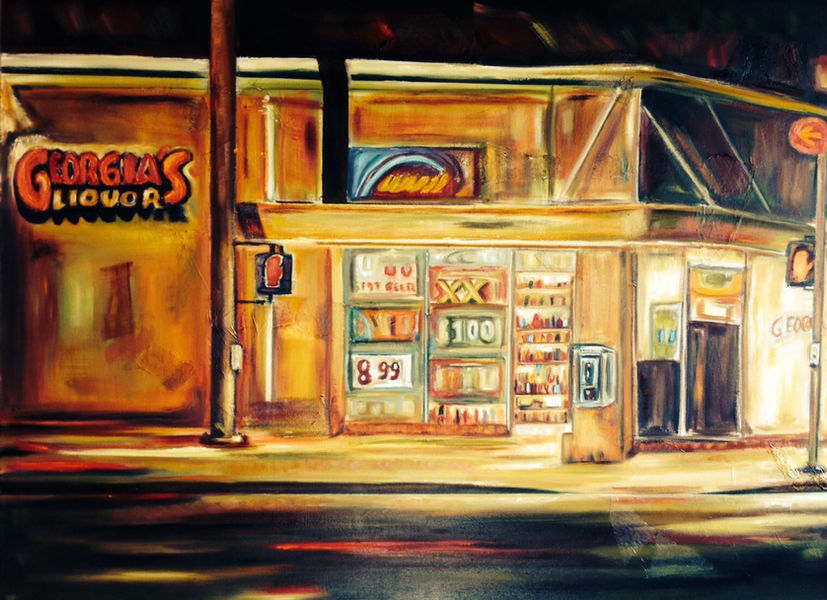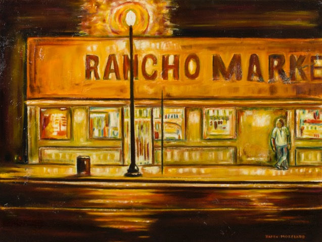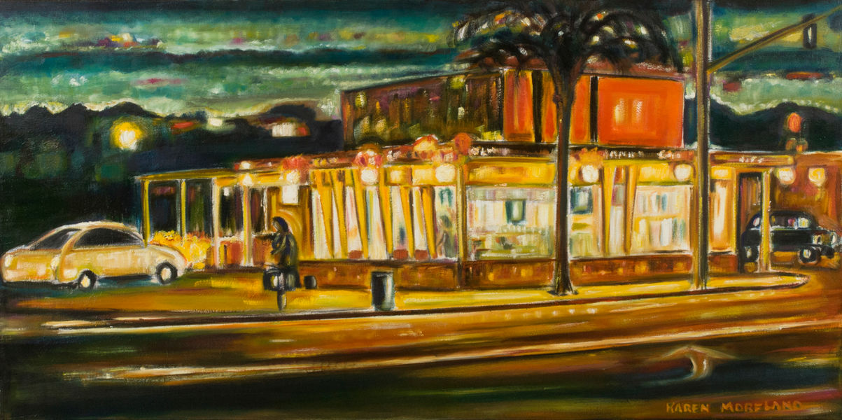 As a North County Resident, I have been influenced by the historic Escondido neighborhoods with the original store fronts, the historic cottages, and the atmospheric lighting of the boulevards of Escondido. I have nine paintings of the city. They are hanging at Vincent's and most are for sale.